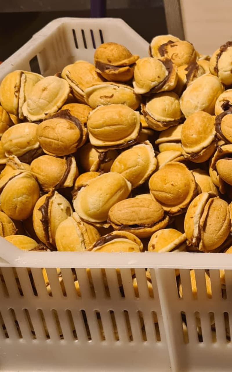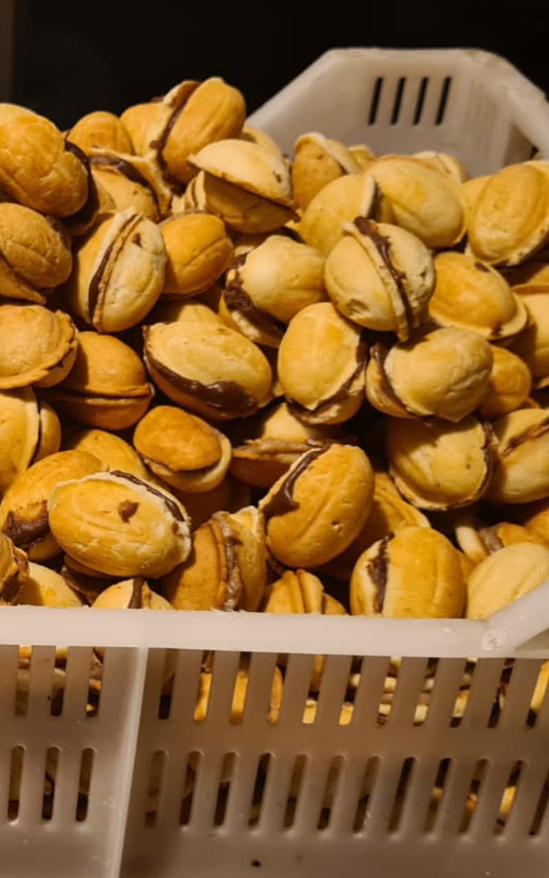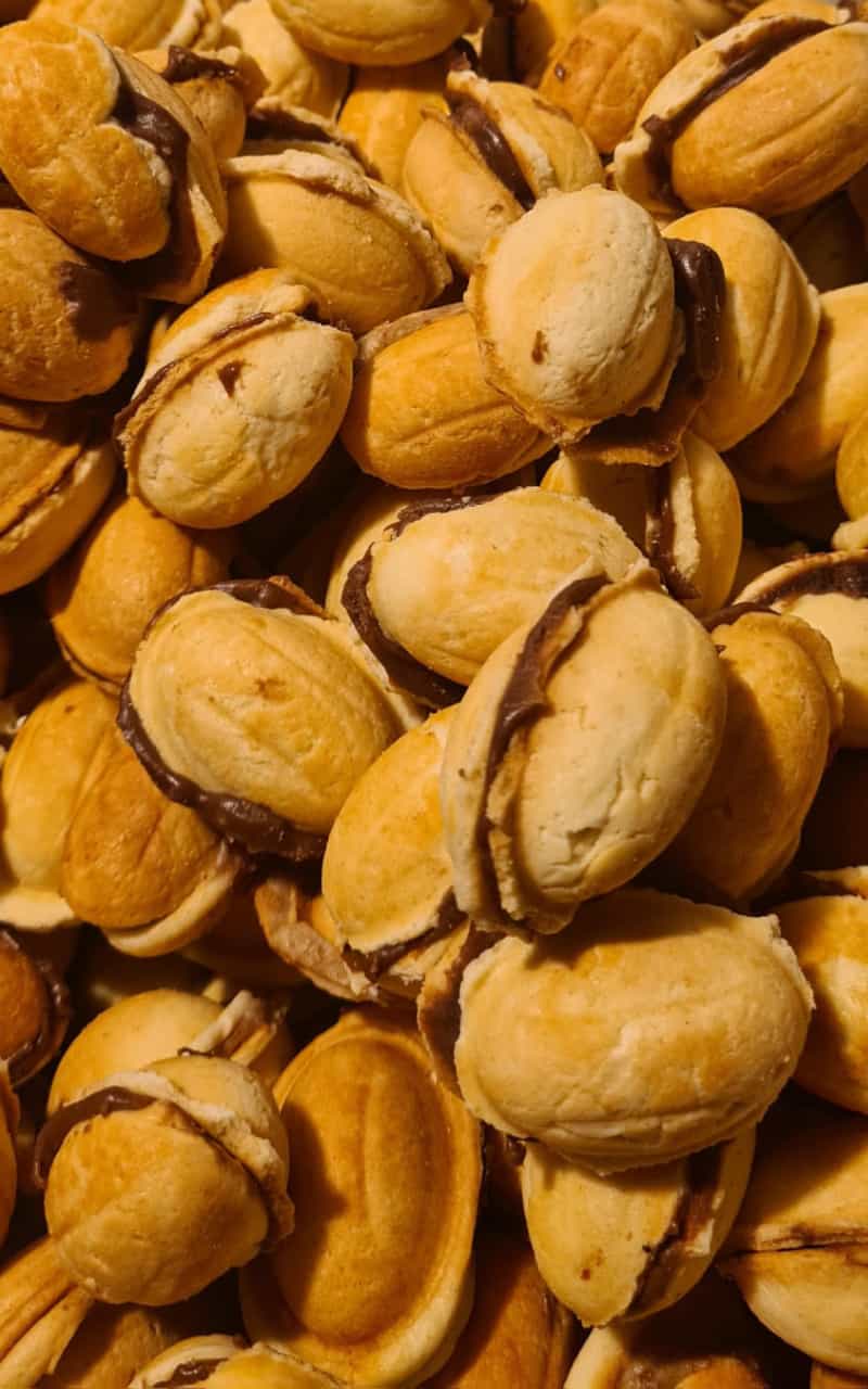 Orzeszki nadziewane to jeden z tych smaków, które zostają w pamięci na zawsze. Kruche, lekko maślane ciasto pieczone w tradycyjnych metalowych formach przypomina łupinkę orzecha włoskiego. Wewnątrz – aksamitny krem, który rozpływa się w ustach. Każdy orzeszek to małe rękodzieło – formowany i nadziewany ręcznie, dokładnie tak, jak robiono to dawniej w wiejskich domach.